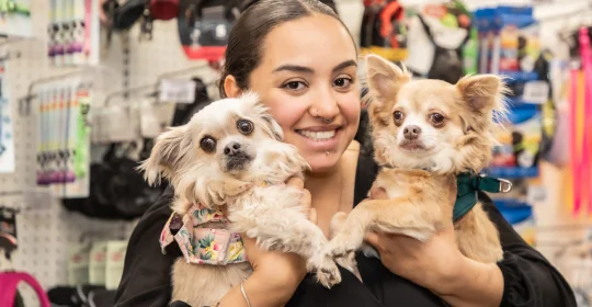 Une gérante de magasin souriante tenant deux chihuahuas nommés Betty et Cody à Argenton-sur-Creuse dans l'Indre